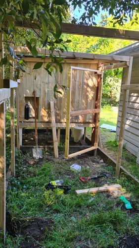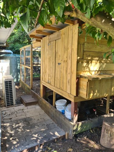 We decided to get chickens so I built a custom coop. After doing some research I decided to build it off the ground for safety from foxes and ease of cleaning. Simply put the wheel burrow at the coop door and sweep the contents off the vinyl floor straight into the wheel burrow, no need to climb in. There is also easy access to the nesting box along the side for egg collection. An automated door from the coop to the run opens and closes during set times. When we are home during the day the chickens free range around the backyard. If we aren't home and want to keep them safe they can stay in the run.