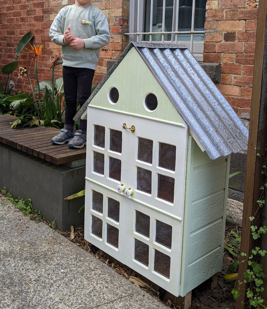 The doors were attached to the main dollhouse with piano hinges. Alignment was tricky and needed a bit of adjusting before the final position was achieved. I added door seal weather strips to all sides (except centre gap) to further weatherproof the doors. Magnetic door latch things were added to keep the doors closed to keep out the rain and also are easy for children to use.