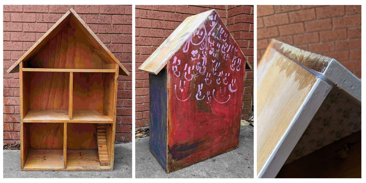 This old dollhouse, originally donated to the kindergarten from a local church, had been kept outdoors for years in the children's play yard. The wood was weathered but the construction was sturdy.