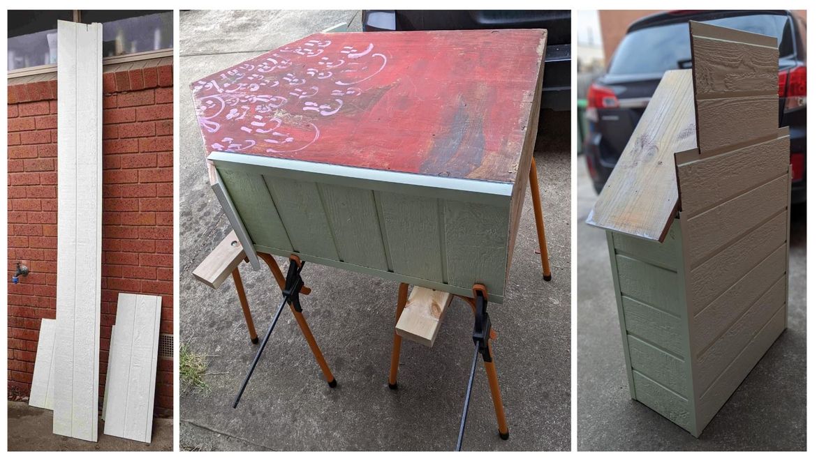 The weatherboard panels were donated by a member of the community, which he had leftover from cladding his house and were about to go in a skip bin. They are made from sustainably sourced hardwood mixed with environmentally friendly resin. He gave me offcuts of various lengths from which I had to cut what I needed to cover the exterior walls of the house. He also donated the metal trimmings for making the ends and corners look neat. He included some leftover green paint too for painting the trimmings and touching up the panels where necessary.