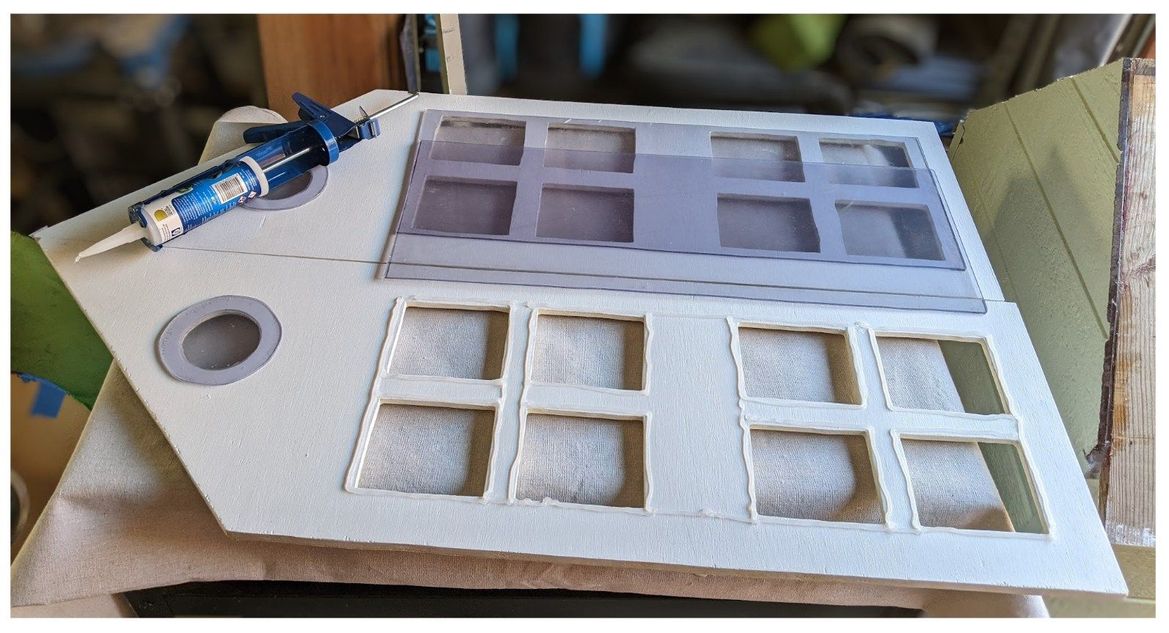 Acrylic sheeting acted as the window “glass”. It is lighter and safer for children than real glass and is easier to cut and handle. I cut it to size with a jigsaw and used poly sealant in a caulking gun to easily attach the pieces to the doors. This also made the windows weatherproof.