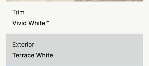 Using the Vivid White as the trim will make an excellent contrast to the Terrace White. However, when the sun is at its brightest it will lessen the contrast between the two colours. But the contrast will stand out in the late afternoon. If you wish to have a nice uniform finish on the walls, I recommend painting the downpipes, rafters and support beams in Terrace White and the gutters in Vivid White.