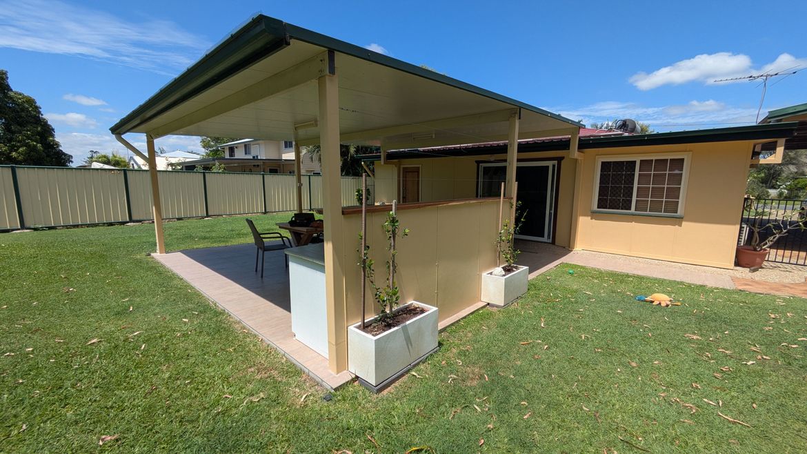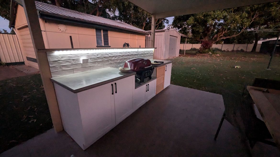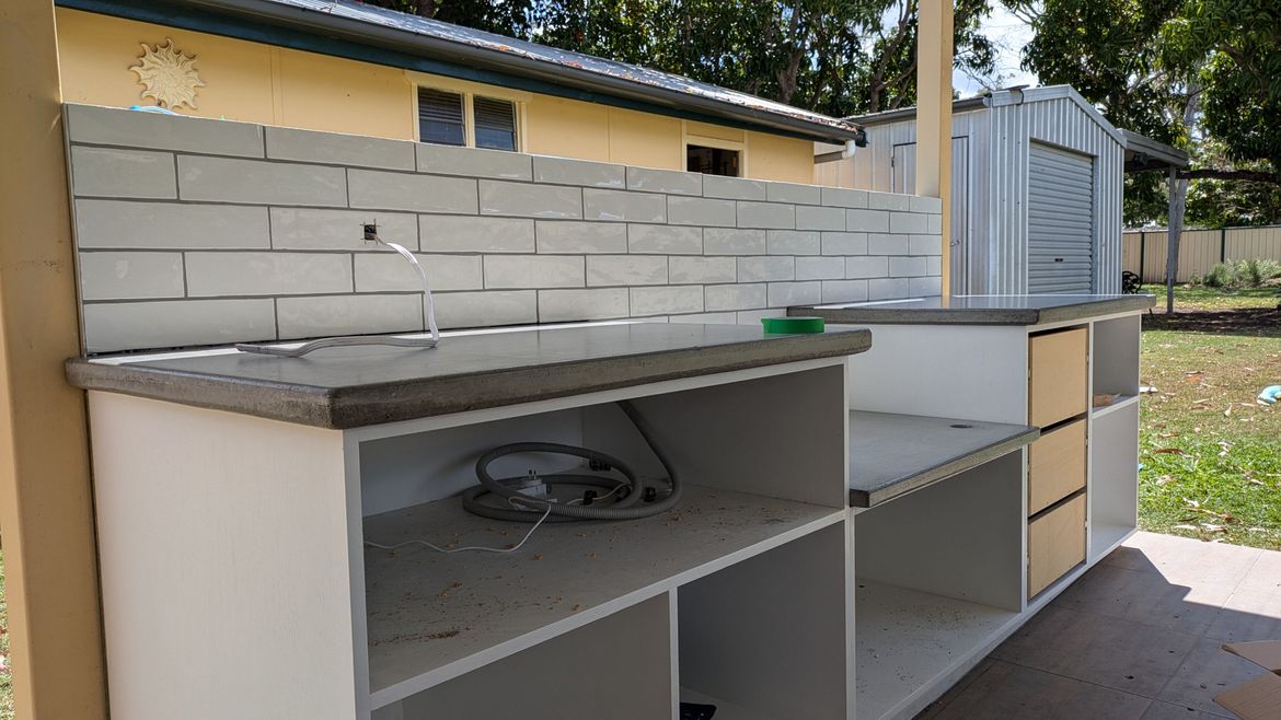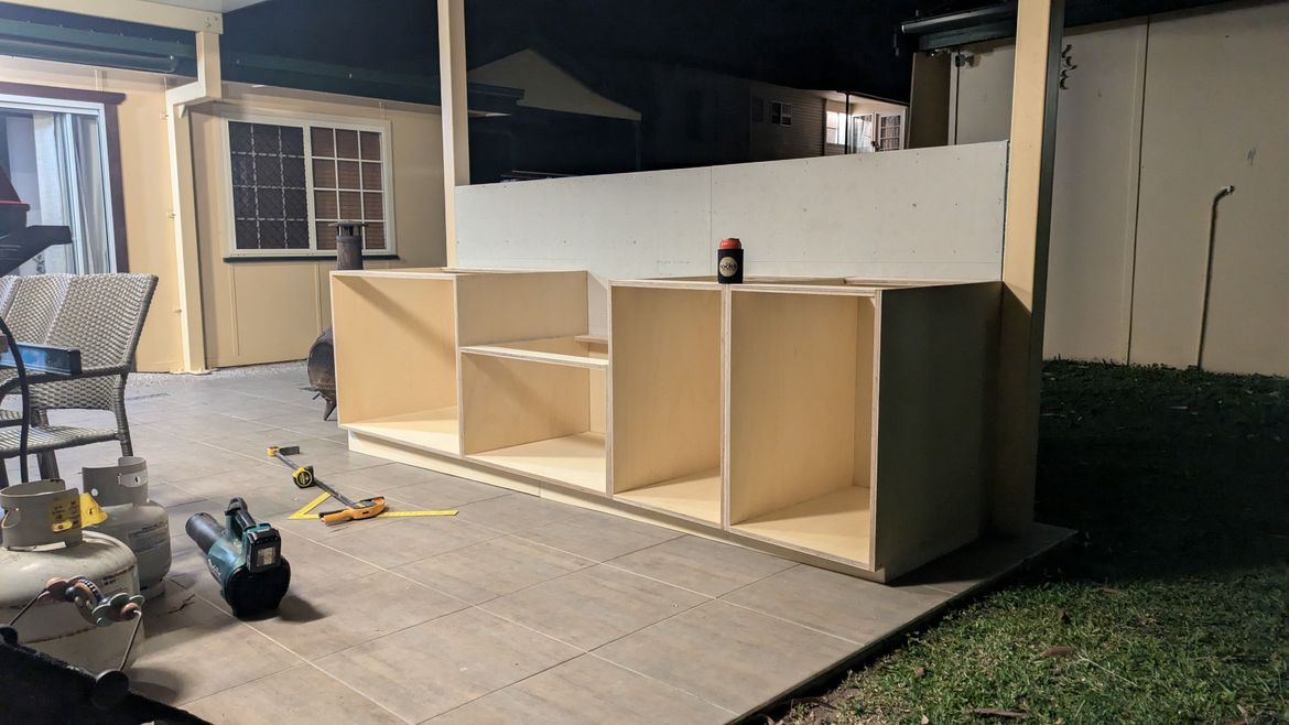 Fibro siding was used to match the house. Electrical wires for power points were placed at this point. Cabinet carcasses were then placed. If you can afford it, marine ply is preferred for cabinets exposed to weather. This area is covered but gets slightly wet when heavy rain comes in sideways. The cabinet base was heavily sealed to make it weather and bug proof.