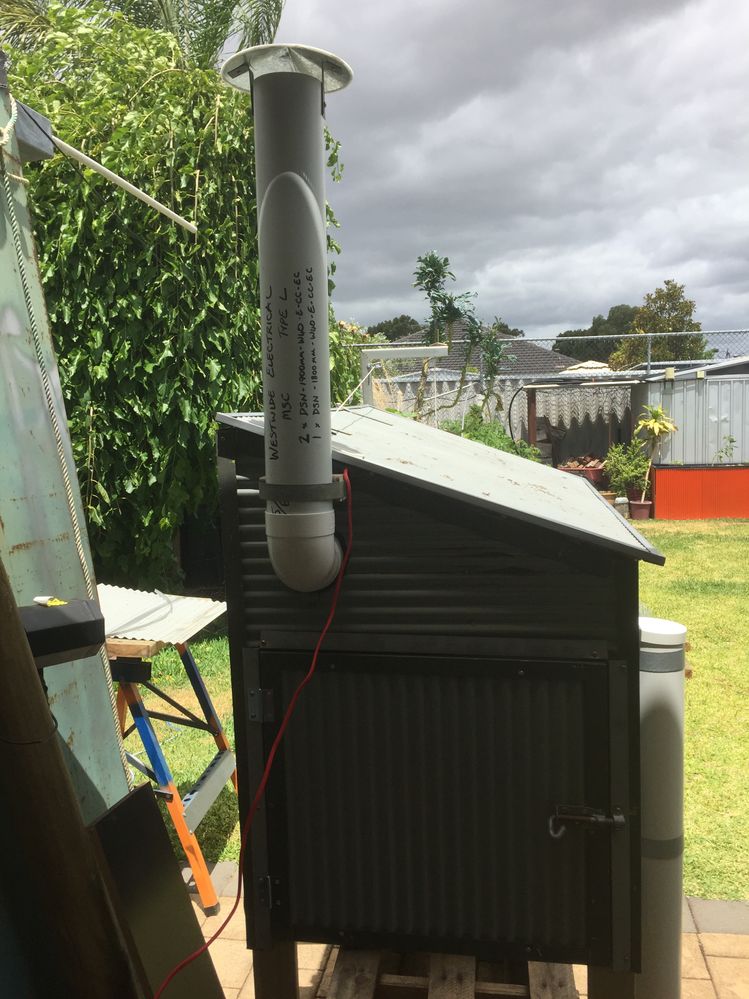 I made up a pvc chimney to allow heat buildup to escape. (The shed is insulated as well). You can see the door to the 2 laying boxes. The lid is also on hinges for easy cleaning.