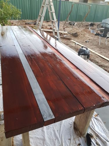 What a beautiful table, the steel strip highlights give your table a modern vibe. This must be a very heavy table, can you tell us how long it took to sand down to prep? What paint and finishes did you use for the benchtop and legs? What screws did you use to fix the timber top to the frame. I'm sure our community members would like to know the details of your build.