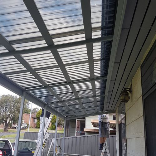 We wanted to re-use the 3 original aluminium verticals, but add 2 more, so more trips to Bunnings, and we wanted to have everything a light grey colour to match the chosen polycarbonate, so sealing, painting everything as we went.