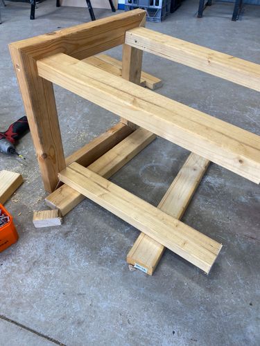 Attach the legs to the frame by using easy spacers made from your off cuts. This will ensure the spacing remains consistent. Be sure to work on opposite sides so that the two sides mirror each other.
