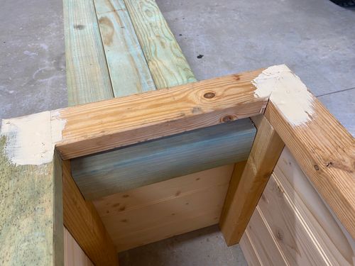 While the filler is drying, move onto making the bench seat section. This will require 3 slats of equal length. I made my seating area 1500mm long as it was made to fit the window but you can adjust this to suit your area. Deciding how tall you would like the seat to be and then remove 35mm to allow for the slats. Build a small rectangular frame to fit this height that will act as a support in the centre. Connect the two parts together by using the 40mm screws through the frame and up into the bottom of the slats.