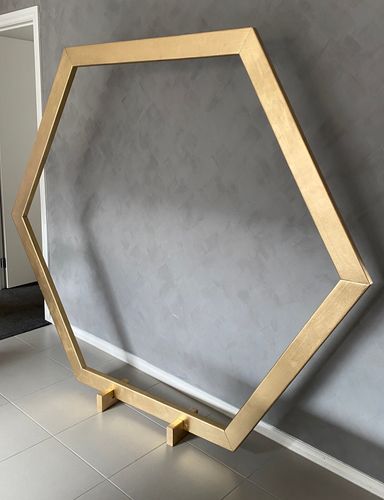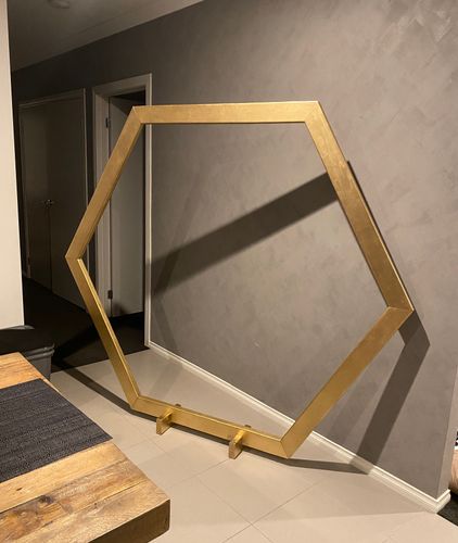After much research they decided on the Hexagon shape, Champagne Gold finish to match their colour theme. After we worked out the size, we also had to plan how it would be transported and reassembled onsite. The best solution was to split it into 3 sections, using the predrilled holes at each join as a guide when assembling.