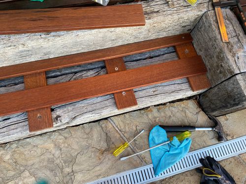 Instead of removing all the sleepers we decided to attach Merbau decking to match the deck located above. I was able to buy one long length at Bunnings and have it cut to length for easy transport. I only had to cut 1 board vertically and the 4 lengths for the base support. I let the timber weather for a few days before doing a final check at my parents making sure all lengths fit perfectly.