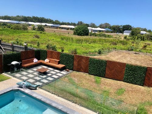 we have used merbau screens for the fence with Un-Real hedge panels & created our own custom bench seat utilised more merbau screens also.