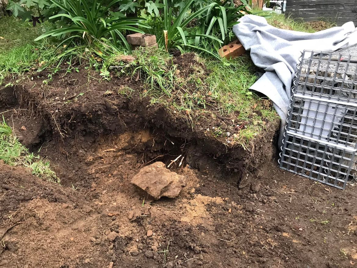 I had to remove the old Bessa block retaining wall. This wall had no foundation and no concrete fill or even rio tie bars in it. I was concerned with the soft soil being an issue with the weight in the cages and also the slope of the land.