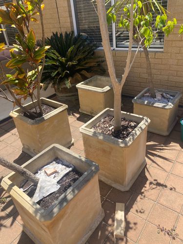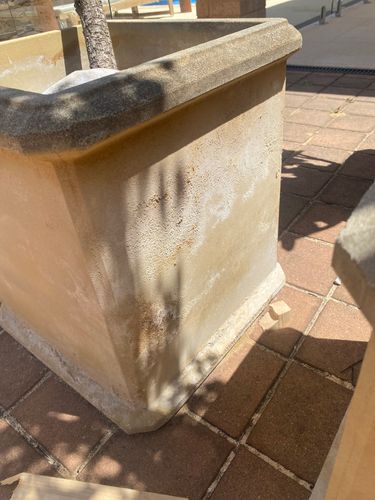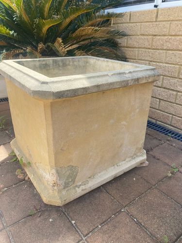 I recommend using Dulux 4L Vivid White Low Sheen Weathershield Exterior Paint tinted to the original colour of the pot. The general steps are to wash the pots in soap and water to remove all the dirt and debris. Make sure that the pot is totally dry before applying Crommelin 750ml Ornamental Sealer. To repair the chipped areas, I suggest using Parfix 1kg Ready To-Use Multipurpose Filler in conjunction with a Pro Renovator 38mm Plastic Scraper. I propose shaping the patch as flat as possible so that you will not have to sand too much off.