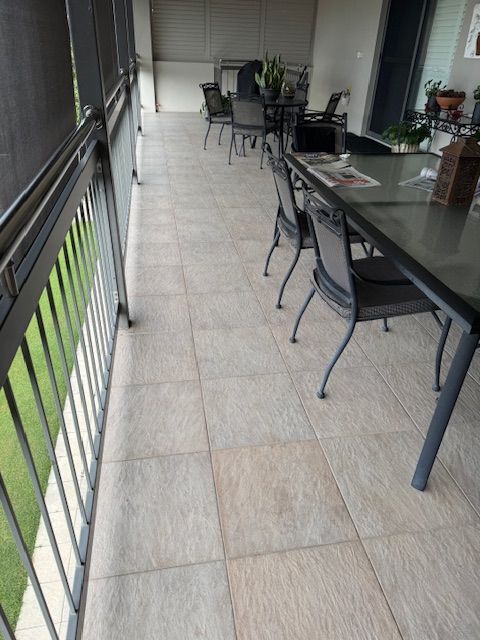 The RYOBI 18V ONE+ HP Brushless Wet and Dry Hard Floor Cleaner would be a great fit for your outdoor tiled area. It vacuums and mops in one go, making the job faster and more convenient compared to traditional mopping. The separate clean and dirty water tanks ensure you're always cleaning with fresh water, and the wide roller helps tackle dirt and debris efficiently.