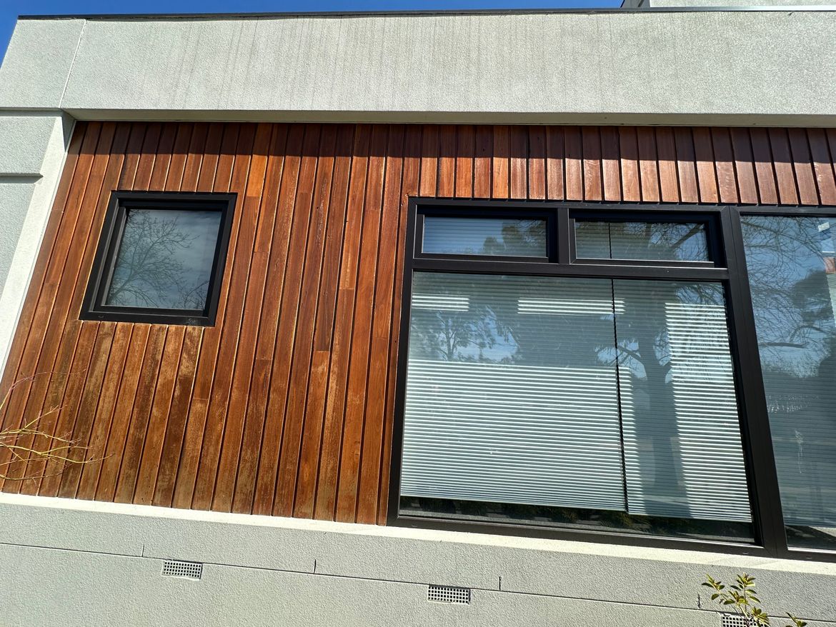 You would then oil the cladding as you would a deck, using an applicator such as this Cabot's Decking Oil Applicator. Applying thin coats will help reduce any drips or running oil. Make sure you use drop sheets to prevent oil dripping on your rendered wall and windows.