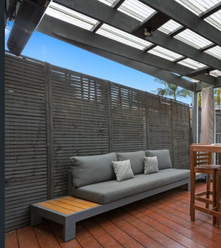 have an undercover patio (seen on right), however furniture on left constantly gets wet as rain enters on an angle between the fence and patio roof. I have seen products like the wall art piece (seen below), but think that water would still enter and was wondering if anyone had any ideas on how to cover this gap, while still looking appealing.