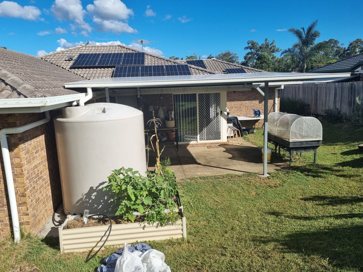 Hi, we had this patio put in a few months ago and it was built overhanging the roof a bit. There is a gap between the roof and the patio and we've only just now had rain heavy enough that I've noticed that the rain splashes off the roof tiles/solar panels onto the area below. How can I prevent this/install something to block the rain in this section. It seems to only be in the section where the solar panels are, the rest of the overhang area along that side seems to be ok.