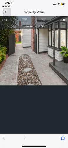 Once the front section has been fixed, I suggest giving the surface a thorough clean with a pressure washer and treated with 30 Seconds 5L Outdoor Cleaner Concentrate and scrubbed with a bristle brush. When you've finished cleaning, I propose removing the old pebbles and re-digging the channel and replacing it with white pebbles. I also recommend removing the square pavers and replacing them with a brighter one such as the Brighton Masonry 400 x 400 x 40mm Cream Mypave Paver.