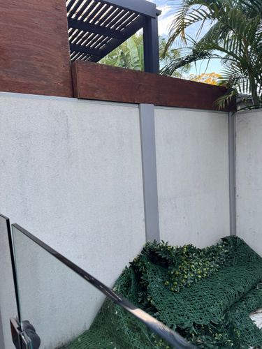Unfortunately, it would not be as simple as just screwing the panels to the existing fence as it appears to be made of fibre cement sheeting, which is not capable of supporting weight. If you tap on the wall, does it sound hollow? Or solid, like it is made of cement blocks?