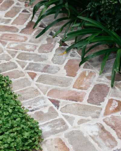 How would a brick patio be installed with a motor washed appearance as in the attached image & which materials to use (other than the obvious paver bricks). The pattern is not important as a straightforward stacked bond pattern can be used.