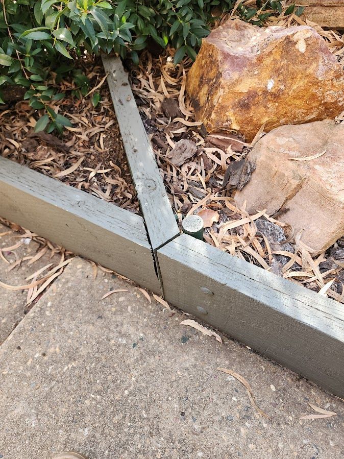 I made treated pine boarders around garden areas with the lower surface resting at the level of the concrete. This was enough to stop bark/mulch from 'escaping' under the sleepers. I found the wet sleepers twisted, buckled and bowed if the ends weren't quickly fastened so I bolted and screwed them to brackets attached to gal pipe embedded in concrete. Various angles can be achieved