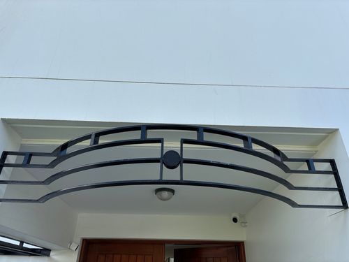 I also wanted to ask if this property is part of an apartment complex. If it is, it's likely that the metal structure in front of your door is there for an ornamental purpose. As for the metal gazebo, I recommend engaging the services of a handy person to disassemble it, as it appears to be a heavy complex structure. But even before doing that, if you are part of a housing complex, odds are there is a body corporate that oversees changes made on your property. I propose asking them first if it is ok to remove these features on your property.