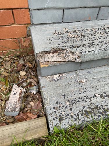 To repair your front door steps, especially given that a large corner piece has broken away, a simple glue fix likely won’t hold well enough. Since glue alone wouldn’t provide the necessary strength, a more durable solution involves reinforcing the broken section with reo (reinforcing) bar. Start by drilling holes into the remaining concrete and the brickwork below it, and then insert lengths of reo bar into these holes to form a solid anchor. This way, the corner will have extra support connecting it to the surrounding structure, making it more secure than the original concrete join.