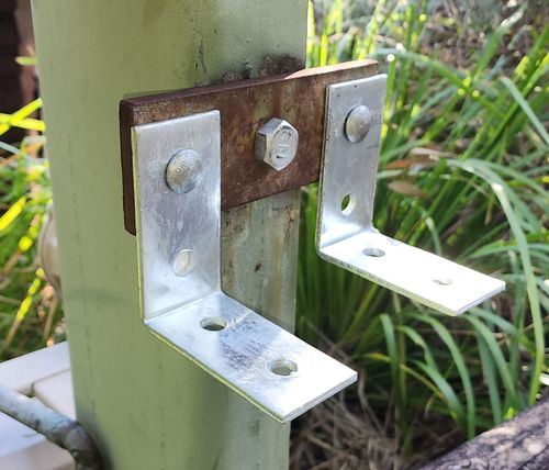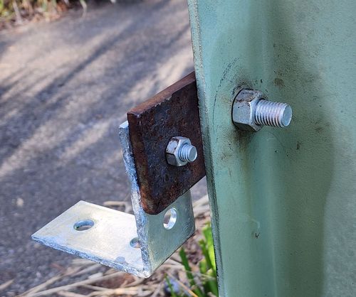 I have an old fence/barrier made of treated pine logs bolted to plates and these are bolted to very large metal posts/girders. The plates and bolts are rusted through and the pine logs are splitting. I can't find any replacement plates nor brackets. How should I attack this?