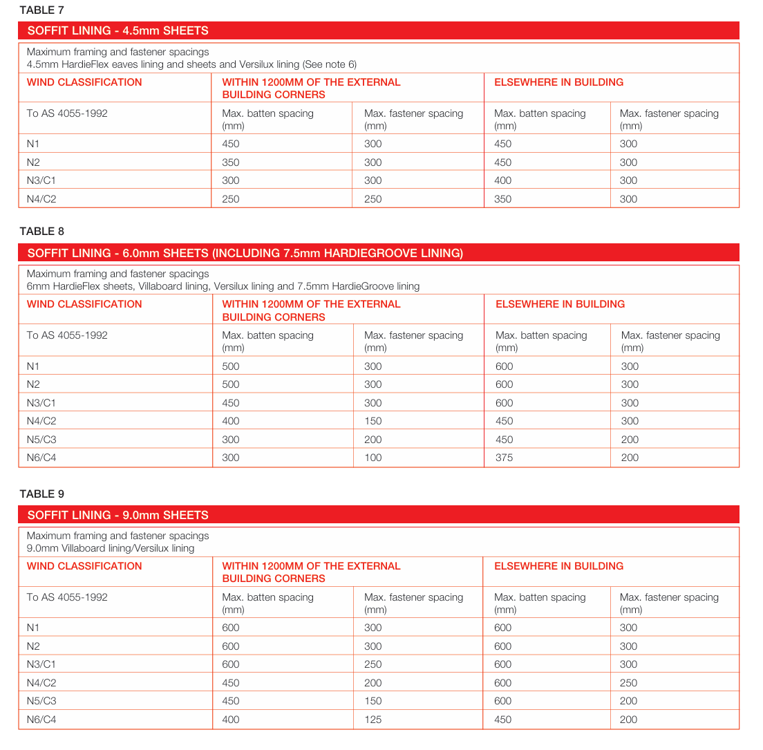 The first thing you'll want to do is assess the framing to see if anything needs to be repaired or replaced. You should also check the spacing of the framing, as different thicknesses of eave linings require different spacing. For example, 4.5mm HardieFlex needs battens to be no more than 450mm apart, whereas 6mm HardieFlex can span 500mm between battens within 1200mm of the external building corners and 600mm elsewhere in the building. Information on this, can be found in the James Hardie Eaves and Soffits Technical Specifications