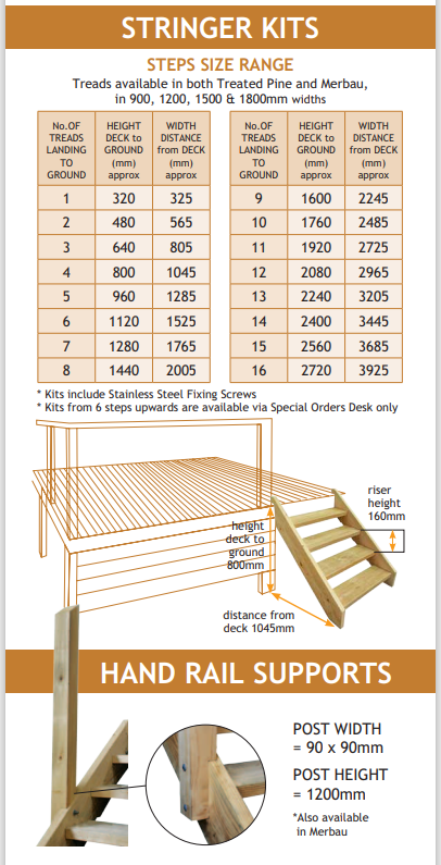 Please note that these stringers and steps will need to be ordered at either the trade desk or special orders desk just in case they are not stocked in your store. The general process of anchoring the steps to the raised deck can involve the use of nuts and bolts, Dynabolts or chemical anchor sets. Plus, heavy duty angle brackets or timber may be used in its installation.