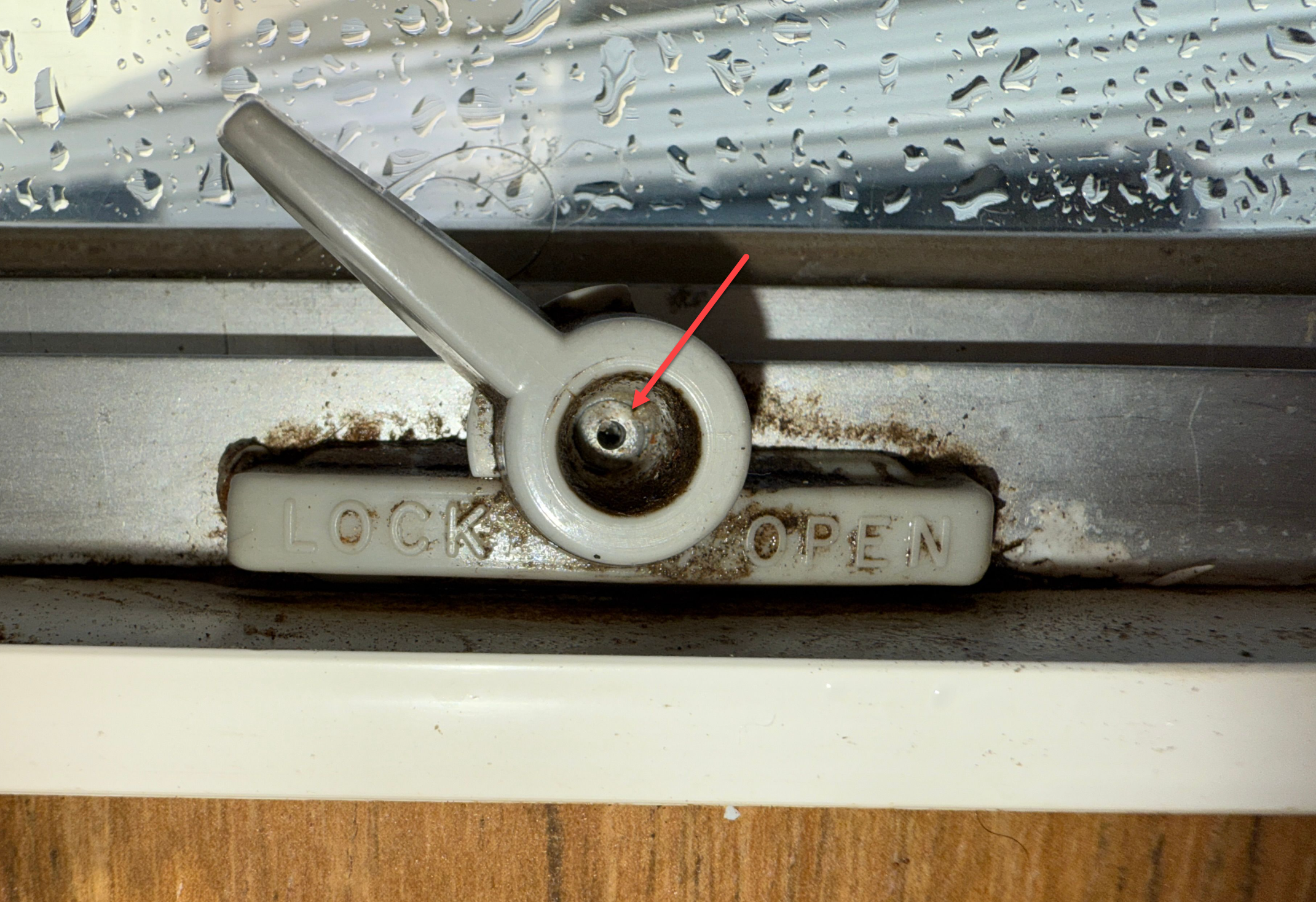 Would it be possible for you to post a photo of the other side of the window lock. I suspect it is an aluminium pressed post and might need to be cut instead of drilled out. Once the other members see the other side of it well be able to assess if it is a giant rivet.