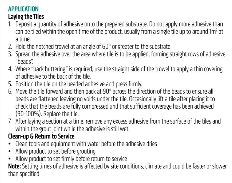 The instructions for back buttering were very general, but it did mention to apply a thin covering only. It would be best that the majority of the adhesive be applied to surface rather than the tile. Remember to follow the installations instructions especially how the tile needs to be moved into position.