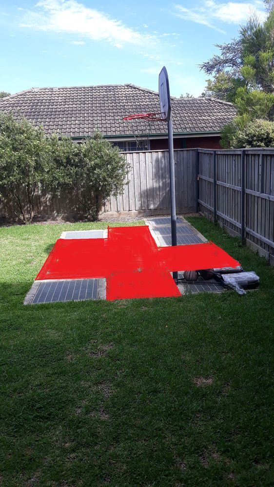 My thought is to remove the grass within the red lines - it a BIG eyesore. Not sure if using Cirtex SurePave plastic pavers (https://www.bunnings.com.au/cirtex-0-5m-surepave-plastic-pavers_p3452192) would do the job so it sits flush with those stormwater retention pit covers. Then lay basketball outdoor tiles over the top. The total area is 4.1 x 3.6 = 14.76 metres square.