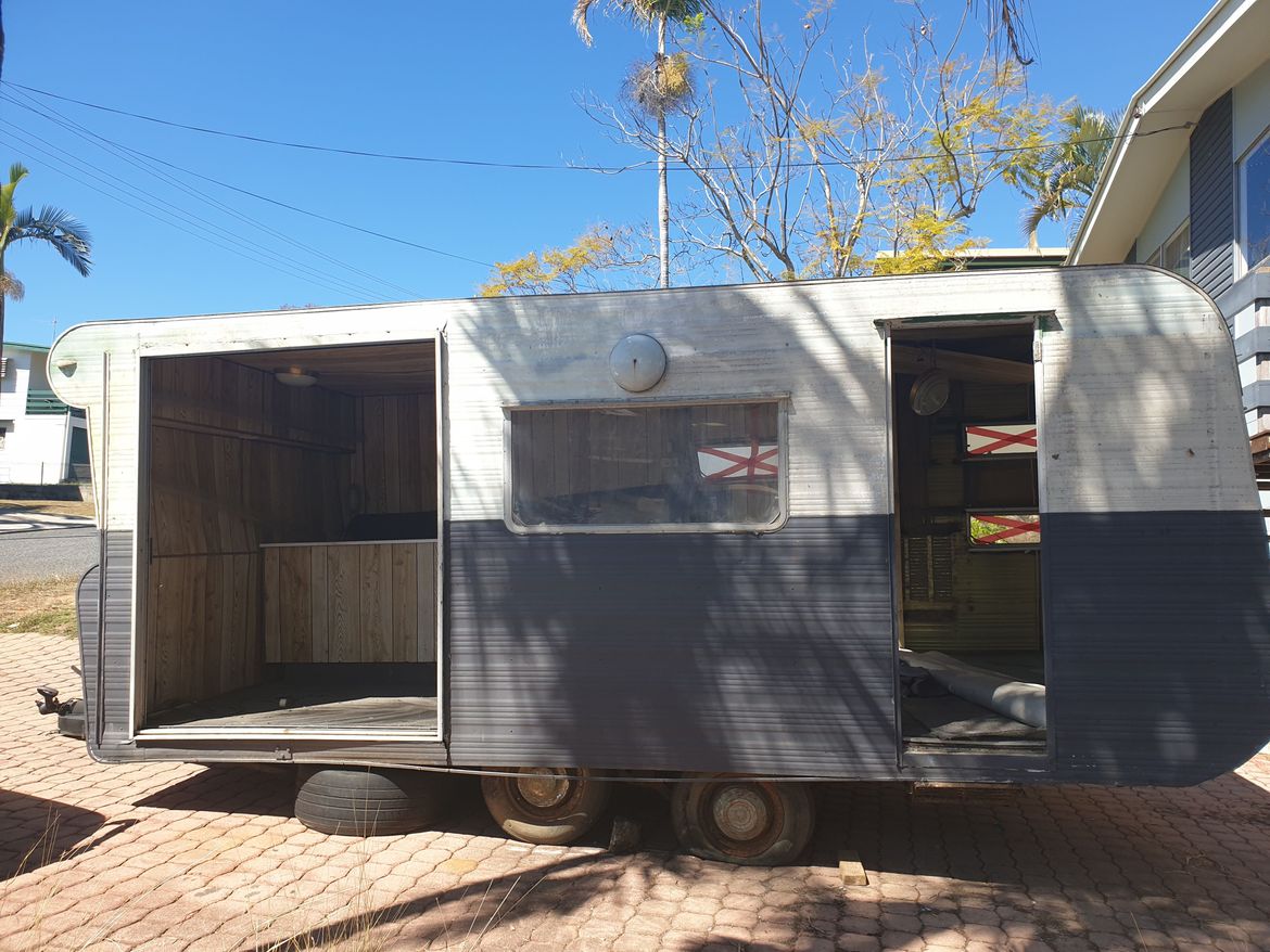 As can be seen a beautiful old Viscount my goal is to turn it int a mobile shop for my Lawn Bowls business it was once a video shop in Toowoomba. I would love ot keep its classic shape but the trip from Mackay has yielded a lot of rotten frame work. I guess it is time breath new life in this beautiful old girl and give her a make over. The right side outside panel had started to come away at its join I am thinking a new frame and composite alluminium sides and where the glass sliding door was a pull down ramp. Make it more accessible.
