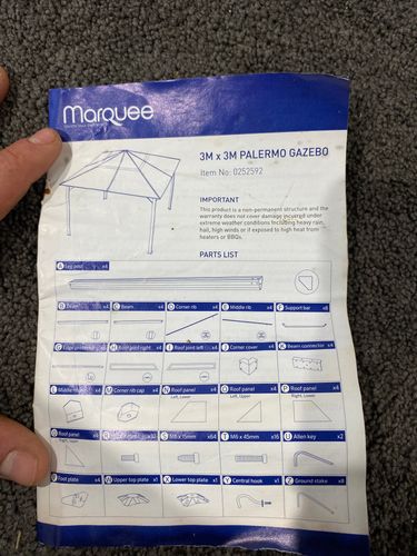 Hi, I’m hoping someone can please help me, I am chasing the instruction booklet for the Marquee 3mx3m Palermo Gazebo. I purchased mine roughly 6 months ago and haven’t gotten around to putting it together, I got the boxes out from the shed the other day and the instruction booklet was wet and all the pages are non readable now. The item code for the booklet is 0252592.
