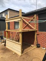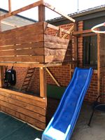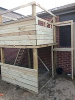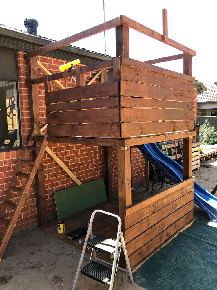 Materials used were timber posts, joists/bearers and accessories from Bunnings and pallet wood that a customer kindly dropped off for me. It was in great condition. Left over Merbau from the decking. I used masonry wall anchors to secure the top decking to the house and concreted the posts for added stability. We have also added left over mulch to the play area and currently working on wooden edging to keep it in. Will be installing a shade sail from above the swing set to the end of the playground. Also due to my middle child’s lack of fear were also going to put something in front of the drain so roof access is restricted. Dimensions L - 2.5m D - 1.8m H - 2.7m.