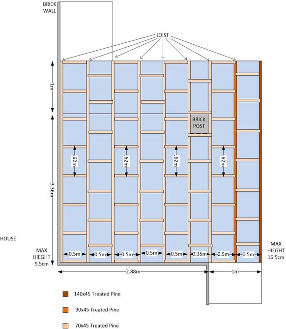 Joist: 70x45mm Treated Pine in the slab area , 90x 45mm & 140x 45mm Treated Pine in pavement as shown below.