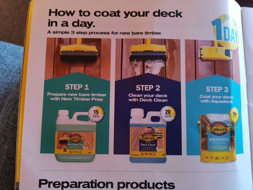 but the Cabot's program seems easier. The deck has been down about 5 weeks and 7w at least by Easter . Do I do the 3 step or can I just do the 2 step from the look of the boards as I want to do it at Easter. From the look of it , how much do you roughly think I will need of each to do the job? Do I oil once or twice with Aquadeck?
