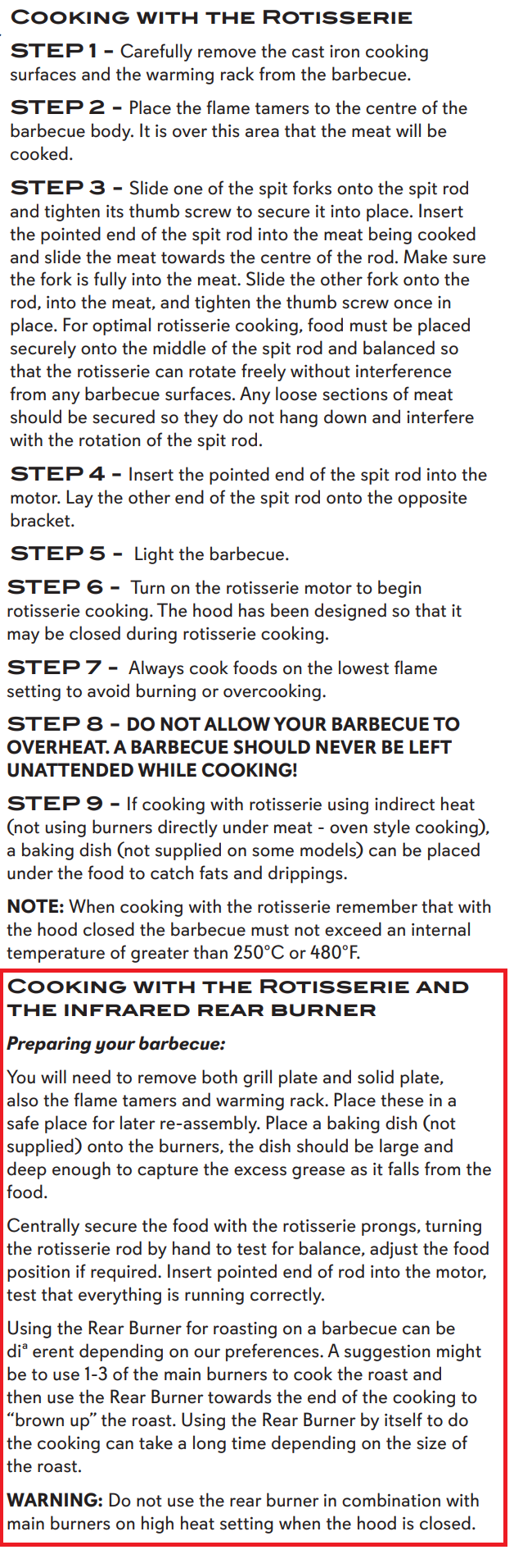 If you read the manual you will notice that it states the rotisserie only has one temperature which is max. Use it towards the end of your cooking just to brown