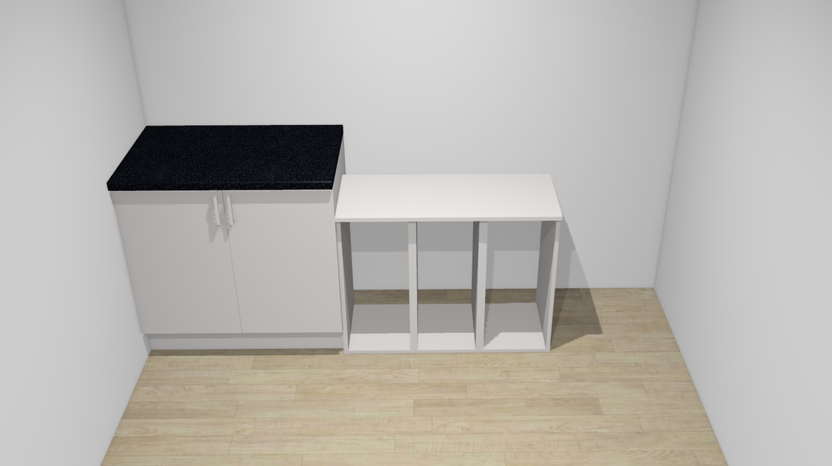 I've added a rendering below. Be advised that as the Essential Stone benchtops require custom work I am unable to add the required benchtop under the BBQ placement area on top of the Kaboodle slimline cabinets.