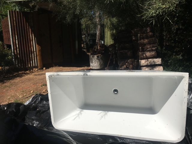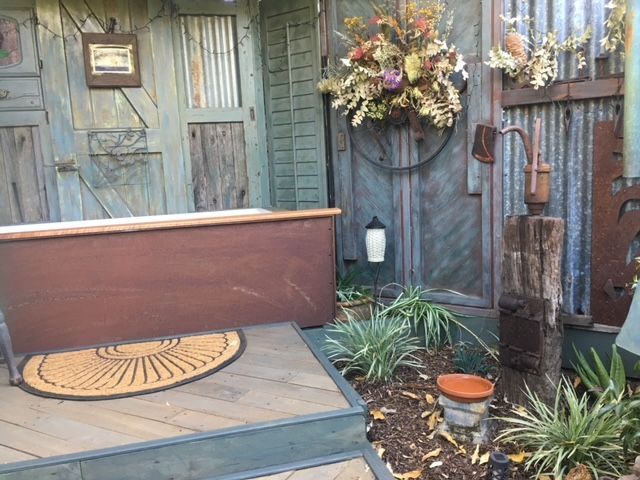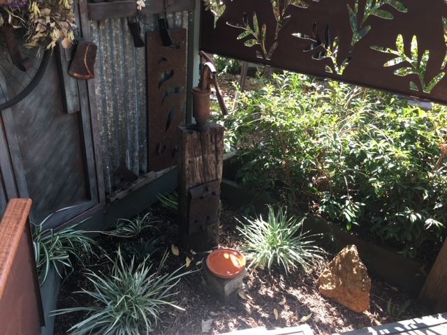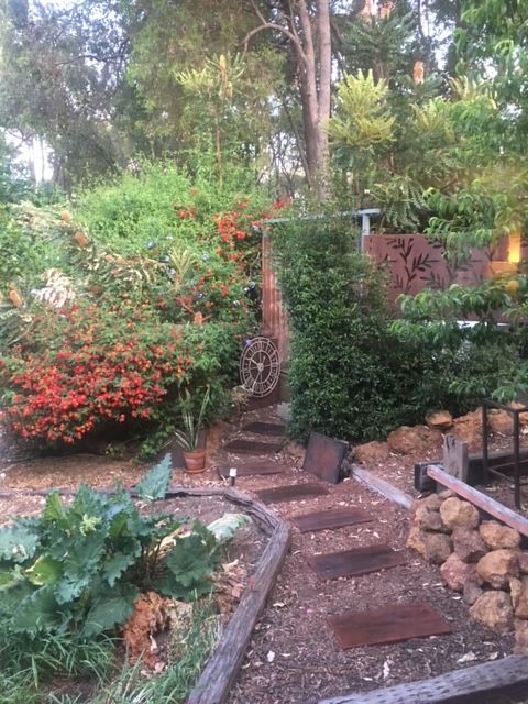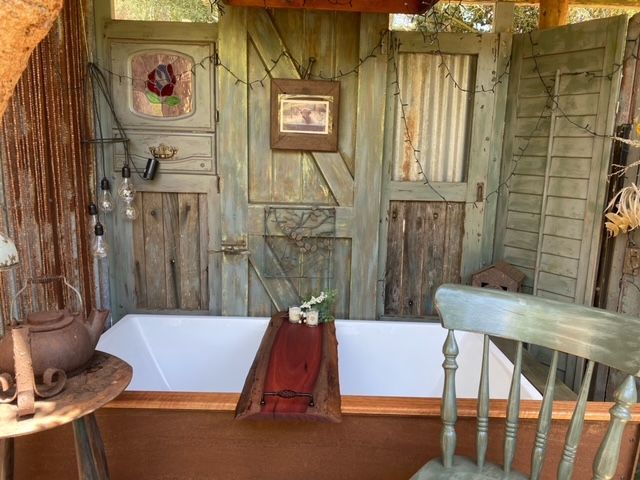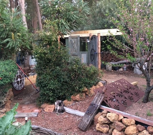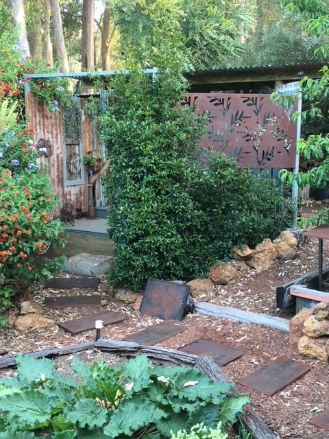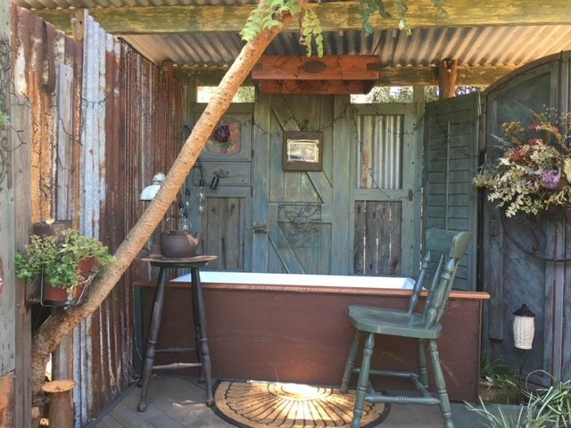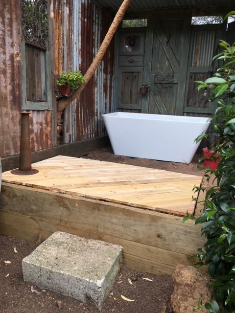 We live in the Perth hills and wanted to create a relaxing outdoor ‘Soak Sanctuary’ which would be private; blend in with the landscape; and create a resourceful, rustic, peaceful ambience, in-keeping with the dense bush surrounding of our property……a place to truly unwind and recharge our batteries. Starting from scratch, we cleared the ground; sourced old doors, cupboards, windows, pallets, rusty bits and pieces, and natural bush-logs. All features and structures were constructed using Bunnings hardware materials, nuts/bolts/screws, paints, power tools, plumbing, metal screen, plants, brackets, timber, and solar fairy lights for night time bathing...so romantic!