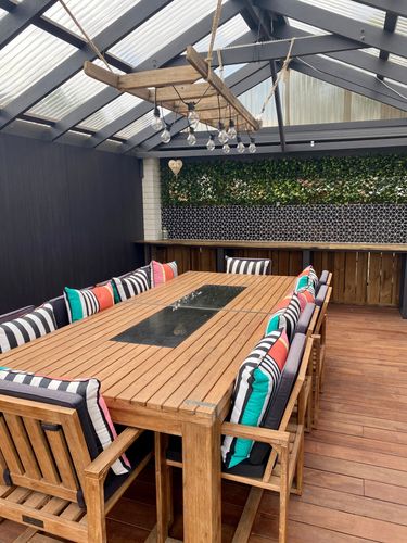 By adding a very basic frame using H3 timber, some Acacia Project Panels, a tile splashback and some unreal hedges, this space becomes more practical and the perfect entertaining area.