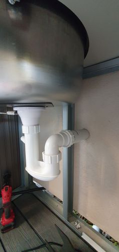 So to drain it away, I purchased a P trap and drilled a 50mm hole in the blue board. With a little bit of reaming, I was able to get a 50mm pvc pipe out behind the board and connected to drainage lines.
