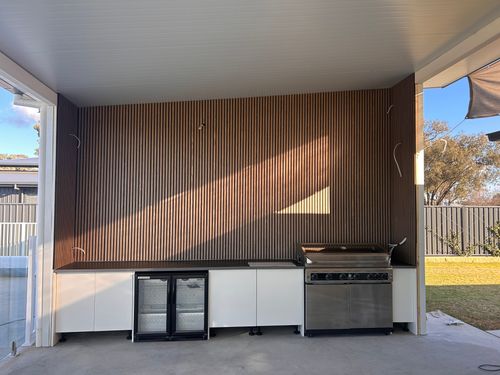 This is an absolutely stunning outdoor kitchen. The vertical batten panels look fantastic with the feature lighting.