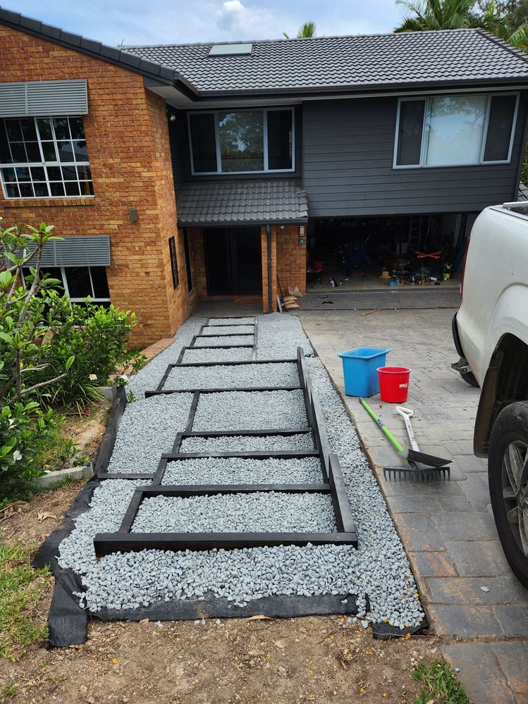 Drainage - as the soil was quick rich in clay one 75 mm sleeved ag pipe was set down the middle of the stairs with another between the driveway and side sleepers.  These joined to drain into existing spoon drain. Drainage gravel over.  Weed mat, then covered with drainage gravel.