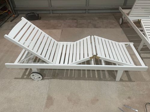 I picked up these 2 Sunlounges and Timber was weathered pretty bad I spent a bit of time sanding them back and had to replace 3 bits of the timber slates in the middle of one lounge and remould the rounded timber edging. I then put a undercoat on them and then 2 coats of Matt white outdoor paint white in colour then sealed it with 2 coats of clear Matt varnish lightly sanding between the coats for added protection from the out door elements. I then put new rubber on the wheels and replace the dowel that held the wheels on as they had rotted and snapped. Also all 4 corners of both lounges had been chewed so I cut them back with a hand saw and sanded them back into shape and also put filler and glue in some of the timber through out them where they had split polished all the gold bolts and parts on the lounges