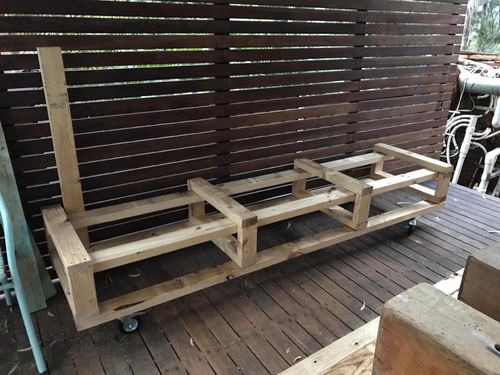 Resting on the wheels so I can get the placing right as I dont want it to be too far apart with the wheelbase. Also testing out the backrest height. It will be double use as a windbreak in the winds if I spin it around so its 90 degrees from where it is now.
