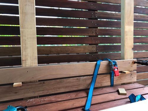 Ratchets are my friend, The merbau slats had bends in them. I use the ratchets to straighten them out and then screw them down.