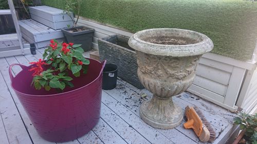 Upcycling your pots with paint is one of the best ways to freshen up their appearance. This also serves as a good time to refresh the soil in your pot. Put your plant in a temporary container for the moment. Because you have an older pot it will be necessary to give it a good clean. Use a Sabco Handled Scrub Brush and some soapy water to clean the outside and inside of the pot. Make sure to thoroughly wash the pot in water and that it is free of soap. Place the pot in full sunlight to make sure that it is totally dry.