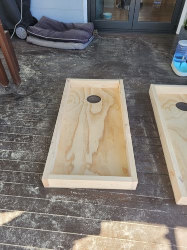 I followed measurments online for a regulation cornhole board. I used an adjustable hole saw to cut the 150mm hole in the two pieces of plywood which would make up the top of the board.